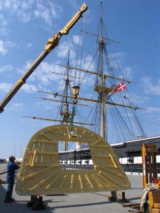Den 14. juni bliver de tre ræer, gaffel og bom løftet i position, så Verdens Længste Træskib kan stå fiks og færdig, når Dronning Margrethe den 28. juni besøger Fregatøen.