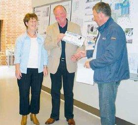 Idrætscenter & Svømmehals lotteri pÃ¥ salg af Vandelsbeviser. SmÃ¥ 560.000 kroner er der solgt for, og formanden for GIS, Jørgen Steffensen kunne i den forbindelse oplyse, at man stadig solgte logo-pladser i den nye svømmehal, som lige nu er under opførelse klods op af Grenaa Idrætscenter. Den nye svømmehal skulle være klar til indvielse sidst i april mÃ¥ned 2008. Det er Norddjurs Kommune, der stÃ¥r bag opførelsen af den nye svømmehal, der skal erstatte den efterhÃ¥nden temmelig nedslidte svømmehal ved Grenaa Søndre Skole. Vinder af 1. præmien - et rejsegavekort fra Ã…rhus Charter pÃ¥ 10.000 kroner - blev Jøns’ Eftf. Skjold Burne Vine v/ Knud Nis-Hansen. PÃ¥ billedet fÃ¥r han overrakt sin præmie af GIS-formanden, Jørgen Steffensen.