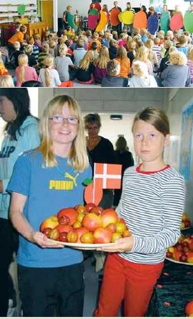 [billede øverst] Toubroskolens 210 elever var samlet omkring en festlig start på Projekt Frugtkvarter mandag formiddag i sidste uge. [billede nederst] Fra mandag den 3. september og to måneder frem får alle eleverne på Toubroskolen et stykke frugt i klassen hver dag - ganske gratis. Skolen er nemlig med i Projekt Frugtkvarter.