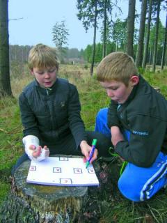To drenge på skattejagt i gang med at løse en af turens opgaver.