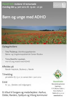 Oplægsholdere: Tine Thulstrup, distriktssygeplejerske, Børne- og Ungdomspsykiatrisk Regionscenter Risskov, og Tinna Boeriths Laustsen, mor til ung mand med ADHD. - Tilmelding på telefon 87132170 senest fredag den 1. juni.
