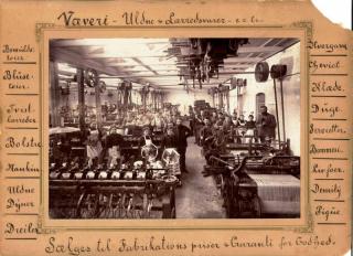 Foto fra vævesalen på Grenaa Dampvæveri anno 1895, to år efter grundlæggelsen. I kanten reklameres for de forskellige typer stof, man kunne levere.
