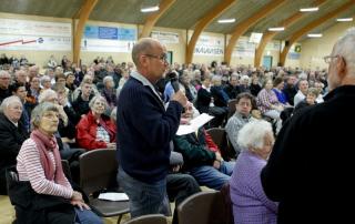 Carl Henrik Christensen hudfletter hér politikerpanelet under stormødet om Allingåbro Skole midt i april.