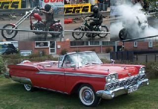 Sidst og ikke mindst: Lørdagens store arrangement var det tredje i rækken af arrangementer, hvor motorcykel-entusiaster mødes til dyst i et dragshow uden sidestykke. Amerikanske biler fra halvtredserne og tresserne skinner om kap helt ind under fronthjelmen. Jeg har overhovedet ikke begreb om biler og motor, for som en ven sagde en gang: Du kigger kun på udseendet! Men det var og er et kønt syn at se de velbevarede retro-biler. Selve racet var vildt. Jeg kan bare ikke fatte, hvordan man tør føre en chopper for fuld styrke med strakte arme. Det så også farligt ud med den vaklende opstart. Gennemsnitsfarten på de store kværne var 180 km/t. Europas hurtigste Puch Maxi brændte dæk af, som om den troede, den var en Kawi... og havde en tophastighed på over 80 km/t.