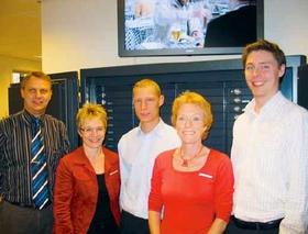 Sparekassen Østjyllands fem medarbejdere i den nye afdeling i Grenaa. Det er fra venstre erhvervsrådgiver Gert Sørensen, afdelingsdirektør Marianne Aabenhuus, rådgiver Søren Worm, ekspeditionsmedarbejder Anette O. Karlsen og rådgiver Christian Kirkegaard.