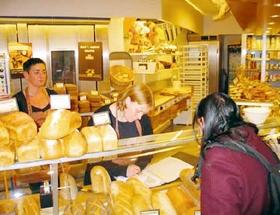 Tina Kjærgaard og Henriette Nielsen betjener kunder i Guldbagerens SuperBest-afdeling, som har udvidet åbningstiden, så man fremover kan købe friskbagt morgenbrød og kager allerede fra kl. 7.00 om morgenen.