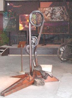 PÃ¥ det andet af billederne, der er taget under forberedelserne til udstillingen, er det i forgrunden en kæmpestor jernskulptur. Man kunne næsten fristes til at kalde kunstneren for ”vores lokale Robert Jacobsen”, for han er nemlig bÃ¥de smed og skulptør. Men bortset fra dét er Ingolf Steffensen fra Stefco i Ørum helt sin egen. I baggrunden kan man se enkelte af de udstillede billeder af nogle af de øvrige deltagende kunstnere.