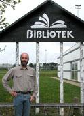 Det nye Nr. Djurs Bibliotek blev officielt indviet i lørdags. Bibliotekar Lars Jørn Larsen, der her viser bibliotekets nye vartegn frem, er glad for de nye lokaler og skønner især på det nye og mere t