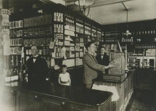 Interiøret i Jens Jensens viktualie-og urtekramsbutik i Østergade 20 i Grenaa. Købmand Jensen står yderst til venstre, herefter hans barnebarn, sønnen og en lærling. Fotoet er fra begyndelsen af 1900-tallet. Foto: Grenaa Egnsarkiv.