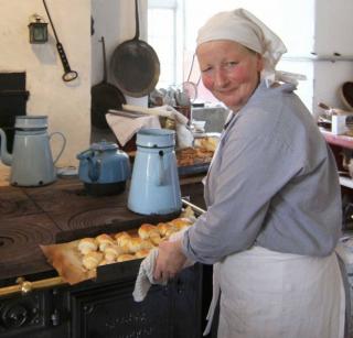 Husjomfruen laver kaffe og kage på det gamle brændekomfur i herregårdskøkkenet.