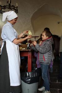 Kokkepigen får hjælp med æbleskrældningen.