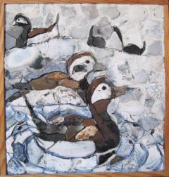 Knud Kristensen finder sine motiver i naturen, fortrinsvis fugle og fisk. Stenene er fra forskellige steder pÃ¥ Djurslands kyster. - Naturstensmosaik er en meget langsom proces, og der vises arbejder fra en lang periode. - Knud Kristensen er født i 1938, bor pÃ¥ Djursland og er læreruddannet. - Teknikken til stenmosaikkerne lærte han pÃ¥ et formningskursus i midten af 60´erne og har siden arbejdet med den teknik.