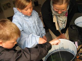 Børnehavebørnene skal prøve at lege med farvning på Farvergården i Ebeltoft.