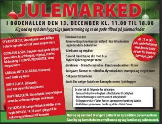I bødehallen vil man finde lokale butikker og private med stande og julehygge. Bjarne Lisby underholder børnene kl. 15. Der er fri entré.
