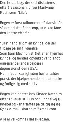For at både gamle og nye medlemmer kan være forberedte til den første aften, kan bogen hentes hos Kirsten Katholm. Hun bor Lindhøjvej 5 i Knebel, og hun kan kontaktes på tlf. 29848467 og e-mail: kkatholm@gmail.com. Alle er velkomne i læsekredsen.
