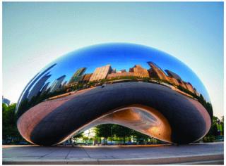 Anish Kapoors 10x20x13 m skulptur The Cloud Gate eller The Bean, på AT og T Plaza i Millennium Park i Chicago, Illinois, USA.
