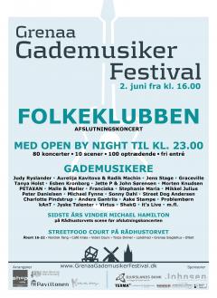 Så er det dagen for Grenaa Gademusiker Festival 2017. En arbejdsgruppe bestående af Kulturskolen, Djurs musik og event, Shop i City og Pavillonen har stået for forberedelserne til festivalen. Et af festivalens formål er at understøtte musikernes muligheder, for at udvikle og afprøve deres talent samt sætte musikken i fokus. Musikerne har gentænkt deres performance, så den passer til mottoet: Håndholdt musik spillet i øjenhøjde. Gademusik er musik i sin rene rå form. Udtryksformen er umiddelbar og nærværende og det er ikke udstyret der bærer den udøvendes performance men derimod musikken, tilstedeværelse og kontakten til publikum. Grenaa Gademusiker festival giver mulighed for at opleve et væld af kunstnere og genre på 10 intime scener placeret rundt i Grenaas midtby i stemningsfyldte gader. Alle optræder 3 gange a 20 min. Festivalen afsluttet med en stor afslutningskoncert med FOLKEKLUBBEN. Der er fri entre hele dagen.