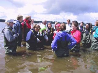 Ud i strandens vand i waders.