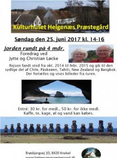 Foredrag ved Jytte og Christian Løcke. Deres rejse fandt sted fra oktober 2014 til februar 2015 og gik til den sydlige del af Chile, Påskeøen, Tahiti, New Zealand og Bangkok. Der fortælles og vises billeder. Jytte er fra Regstrup på Sjælland og Christian er fra Helgenæs, hvor han er opvokset på Kokkegården. Jytte og Christian har drevet et økologisk landbrug ved Skive i ca. 30 år. - Entré: 50 kr., - dog kun 30 kr. for medlemmer.