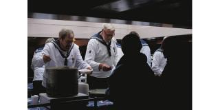 Når man har købt sin mad- og drikkevarebillet står skibskokken og hans koksmather klar i matrosuniformerne til at servere menuen. Og så er det bare at sætte sig ned ved bordene mellem de mægtige kanoner og nyde maden.