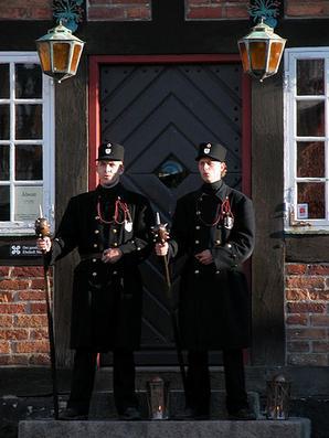 Vægterne på trappen til det gamle rådhus i Ebeltoft.