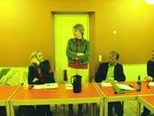 Efter en let arbejdsfrokost mødte de tre formandskandidater op. De gav hver især et bud på hvorfor netop han/hun skulle være det bedste valg til posten. Vi kunne ved selvsyn konstatere, at Villy Søvndal (siddende til højre) ikke er så gammel og udbrændt, som pressen vil gøre ham til; at Meta Fuglsang (stående i midten) ikke er så farveløs, som samme presse gerne vil have os til at tro, og at Pia Olsen (siddende til venstre) ikke kun er EU og miljø. Det er et luksusproblem for et parti at have tre så absolut kompetente kandidater, der har lyst til at løfte opgaven som formand. Alle tre gav tilsagn om, at uanset, hvem der vinder urafstemningen om posten, så bliver alle i SF som aktive forkæmpere for SF’s politik. Den kombination af ressourcer, de besidder, er et stort aktiv for partiet, lige som den absolut fordragelige tone formandsvalget finder sted i. Der var ikke skyggen af fløjkrig eller spildte kræfter i deres valgkamp. Det var dejligt som menigt medlem at opleve.