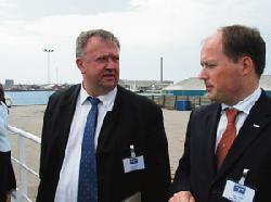 Havnedirektør Henning Laursen (t.v.) overrakte en plakette til kaptajnen på »Beluga Resolution«, fordi der var tale om skibets første havneanløb nogensinde efter at være blevet indsat i ordinær drift. Det er dog ikke kaptajnen, som havnedirektøren ses sammen med på billedet her.