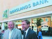 Her ses Djurslands Banks bestyrelsesformand Erik Nymann (t.v.) og bankens direktør Ole Bak i forbindelse med offentliggørelsen af bankens nye logo i september. Det seneste kvartalsregnskab viser, at banken styrer mod et super-flot årsresultat for 2005.