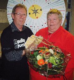 På billedet overrækker bingoværten Poul Elo Bach gavekort og blomster til den første bingovinder, Marianne Juul Pedersen fra Grenaa. Blomsterne er forøvrigt sponseret af Anemone Blomster i Grenaa