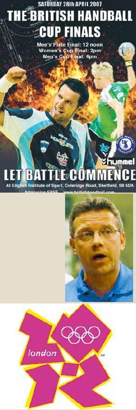 [øverst]Sådan reklamerede The British Handball Association for sine pokal-finaler for hhv. herrer og damer her i foråret 2007. I øjeblikket overvejer briterne, om de skal iværksætte et stort OL-forberedelses-projekt for kvindelandsholdet i forbindelse med OL i London om 4 1/2 år. Et projekt, der måske havner i Grenaa. [midten] Landstræneren for det britiske kvindelandshold, Morten Arvidsson, har foreløbigt sendt fire af sine spillere til Grenaa. [nederst] Logoet til OL i London 2012