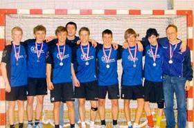 Her ses de nykårede DM-sølvvindere fra Djurslands Efterskole. Fra venstre: Philip Søe, Simon Holm, Christian Vester, Anders Rasmussen, Casper Nedergaard, Filip Nyholm, Mads Tølbøl, Mathias Jensen og træner Leif Kruse.
