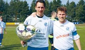 Før hjemmekampen mod Frederikshavn blev GIF's solide midtbanespiller, den 29-årige Simon Sørensen, hyldet for sin kamp nr. 250 i GIF-trøjen. Han fik overrakt blomster af anfører Søren Johanson (til højre).