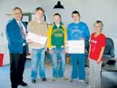 På billedet får vinderen af rejsegavekortet Ingelise Outzen udleveret sin præmie, mens Hugo Andersen fra Sparekassen Kronjylland overrækker en check på 2.000 kroner til nogle af junior-drengene fra Åstrup/Hammelev.