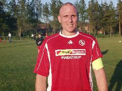 Michael Kruse Rasmussen med tilnavnet “Fjolle” lavede et flot mål i lokalopgøret. I denne uge styrer han, der er guitarist i fritiden, “det kontinuerlige ur” ved sommerfestfodbolden på fredag i Pindstrup.